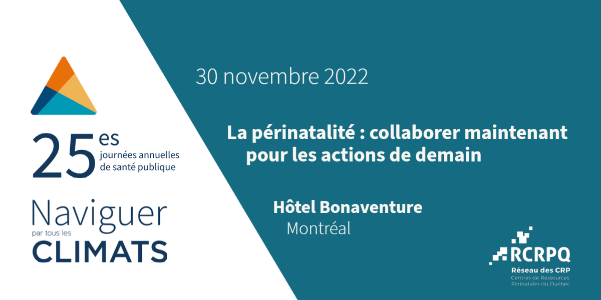 Le RCRPQ tiendra une activité de type « laboratoire d’idées », le mercredi 30 novembre, à l’Hôtel Bonaventure de Montréal, dans le cadre des Journées annuelles de santé publique (JASP). Sous le thème La périnatalité : collaborer maintenant pour les actions de demain, l’activité vise à favoriser une collaboration optimale entre les acteurs du réseau de la santé et des services sociaux, du milieu communautaire et de la recherche, impliqués en périnatalité. Il s’adresse aux intervenant·es, clinicien·nes, gestionnaires, décideuses et décideurs, chercheuses et chercheurs œuvrant dans le domaine de la périnatalité ainsi qu’aux étudiant·es.